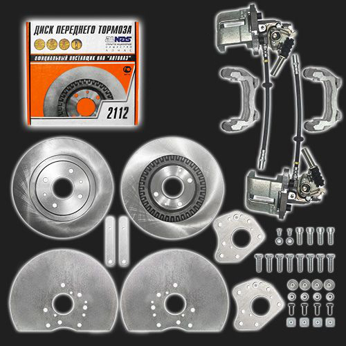Тормозные колодки в комплект не входят. Применяются любые передние тормозные колодки ВАЗ 2108/2110.