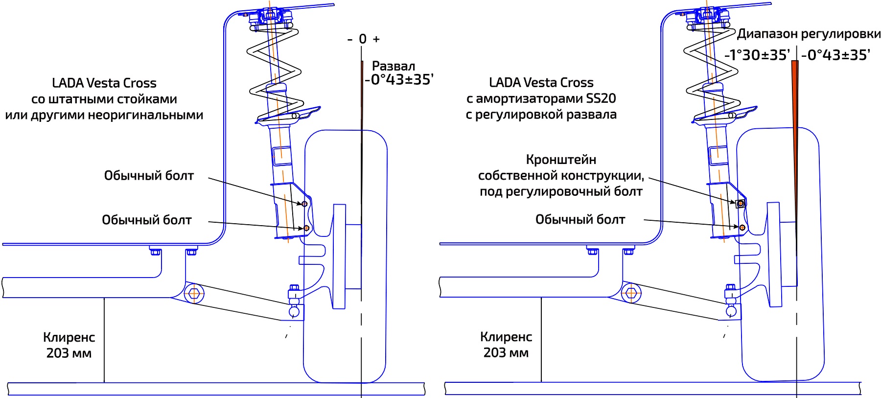 Самое главное отличие и преимущество - передние стойки SS20 LADA Vesta Cross позволяют регулировать развал передних колёс, в отличие от всех других стоек на данный автомобиль. Поэтому можно гарантированно обеспечить регулировку отрицательного развала на передних колёсах. Почему данная проблема важна для версии Кросс? Дело в том, что для увеличения клиренса в версии Cross передняя стойка имеет увеличенную высоту. На автомобиле она занимает другое положение по сравнению с обычной Lada Vesta. И в месте со стойкой меняет свое положение переднее колесо. Увеличивается положительный развал.