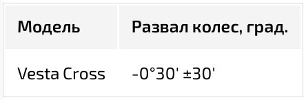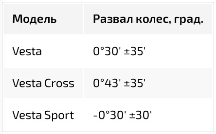 Так, для версии Sport заложен отрицательный «угол» развала передних колёс, для обычной версии угол уже положительный, а для версии Cross развал ушёл в ещё более положительную область. Положительный развал передних колёс ухудшает сцепление колеса с асфальтом в повороте, так как к положительному развалу добавляется дополнительный завал колеса, вызванный креном кузова (смотри поясняющую схему). В результате большого суммарного наклона колеса боковина шины деформируется - подламывается и колесо ухудшает свои сцепные свойства. Происходит увод автомобиля с траектории, а при высокой скорости или при более крутом угле поворота может привести к сносу передней оси и изменению траектории движения автомобиля. Отрицательный развал, предусмотренный для автомобиля Lada Vesta Sport, позволяет сохранить достаточный зацеп передних колёс в повороте.