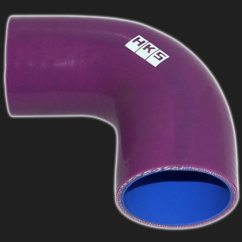 Переходной силиконовый патрубок фиолетового цвета с надписью «HKS», угол 90°, диаметр с одной стороны 45 мм, с другой - 51 мм.
