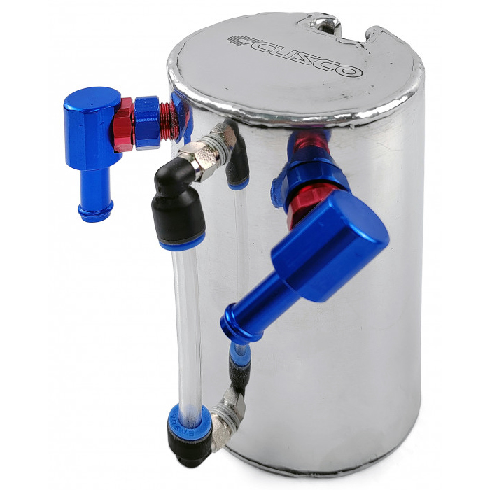 Маслоуловитель предназначен для отбора масляной взвеси с картерных газов. Как правило, в самой простой "версии" присутствует в любом двигателе внутреннего сгорания. Предлагаемый маслоуловитель в стиле CUSCO помимо привлекательного дизайна и большого объёма имеет индикацию заполнения и разведённые по бокам штуцера. У данной модели отсутствует сливная пробка. Маслосборник "врезается" в верхний шланг вентиляции картерных газов, либо вентиляция "замыкается" на маслоуловителе, а картерные газы выводятся в атмосферу через специально предназначенный для этого фильтр.
