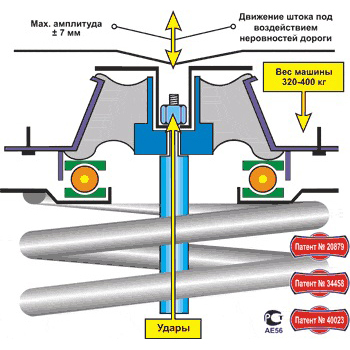 Подшипник пылевлагозащищённый, пакетированный - гарантия длительного срока эксплуатации в любой климатической зоне России. Пружина смягчает удары на подшипник и, следовательно, на кузов. При повороте руля одновременно вращаются: корпус стойки, пружина и колесо, а шток и поршень остаются неподвижными. Это вращение обеспечивает равномерный износ хромированного штока и рабочего цилиндра и, соответственно, увеличивает срок службы стойки в целом. Шумопонижение передней опоры SS20 намного превышает шумопонижение штатной опоры, так как резиновый демпфер находится в ненагруженном состоянии и резиновое волокно находится в наименьшей точке сопротивления. Поэтому гашение высокочастотных составляющих колебаний подвески наиболее эффективно, а также это обеспечивает смягчение ударов по амортизатору.