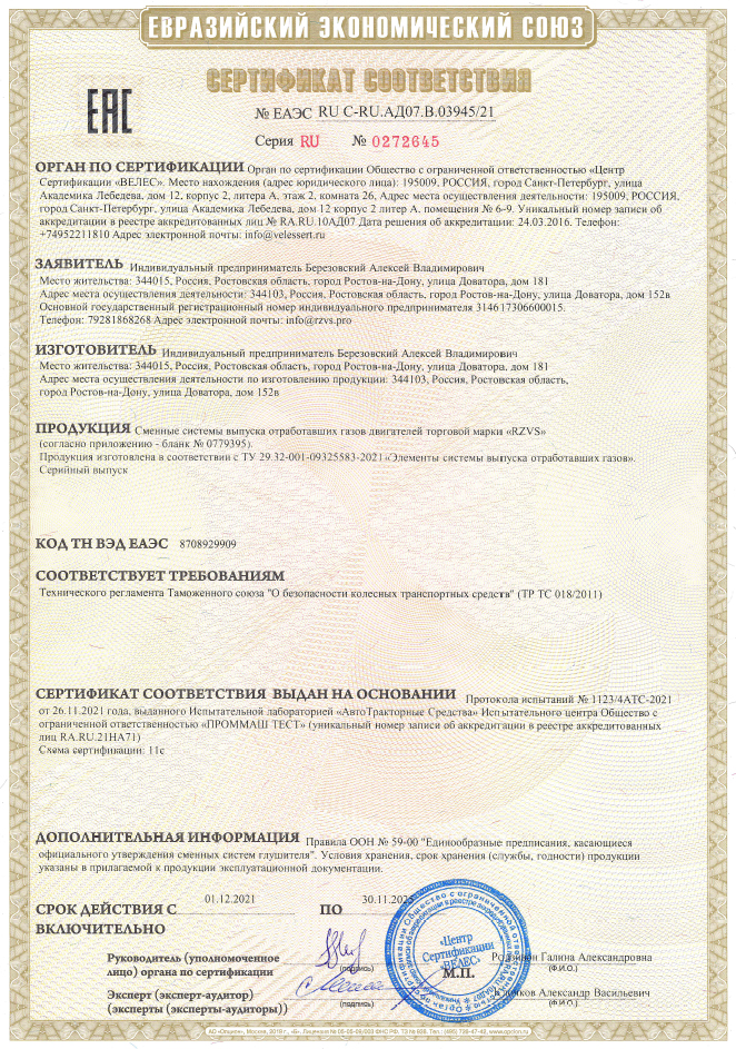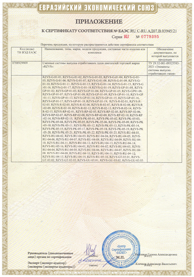 Продукция «RZVS» прошла все необходимые сертификационные испытания в Аккредитованной испытательной лаборатории. Качество продукции подтверждено Сертификатом соответствия ЕАЭС RU C-RU.АД07.В.03945/21.