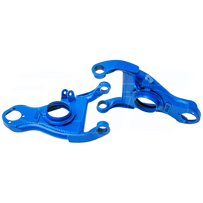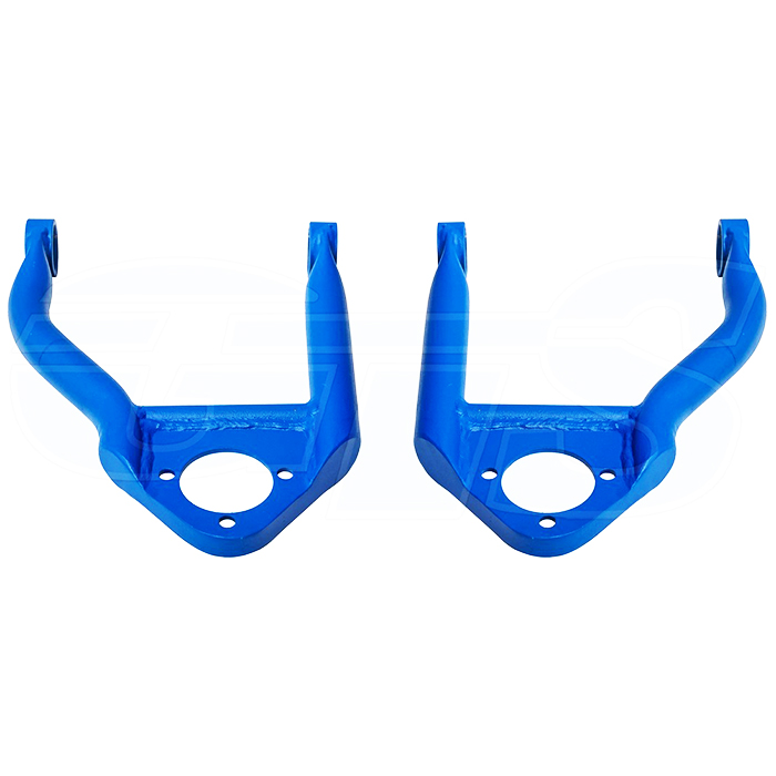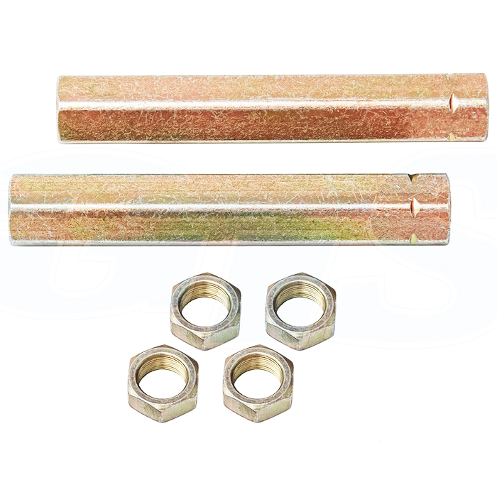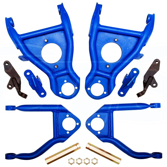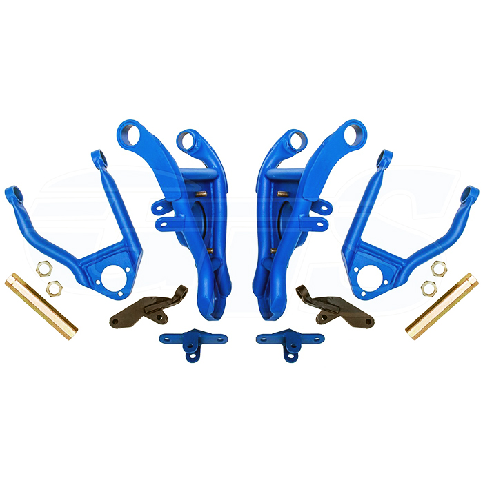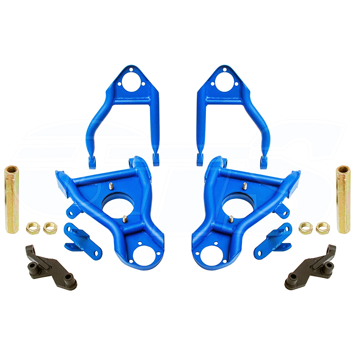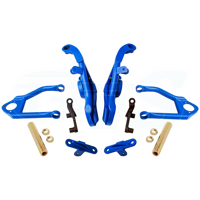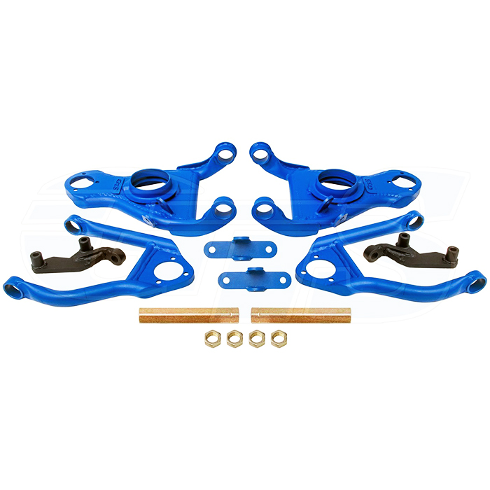 В комплекте: 2 верхних рычага, 2 нижних рычага, 2 усиленных кронштейна амортизатора, 2 укороченные рулевые сошки (-90 мм), 2 удлинённых шестигранных рулевых сгона (140 мм) с 4 контргайками.