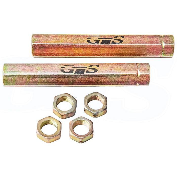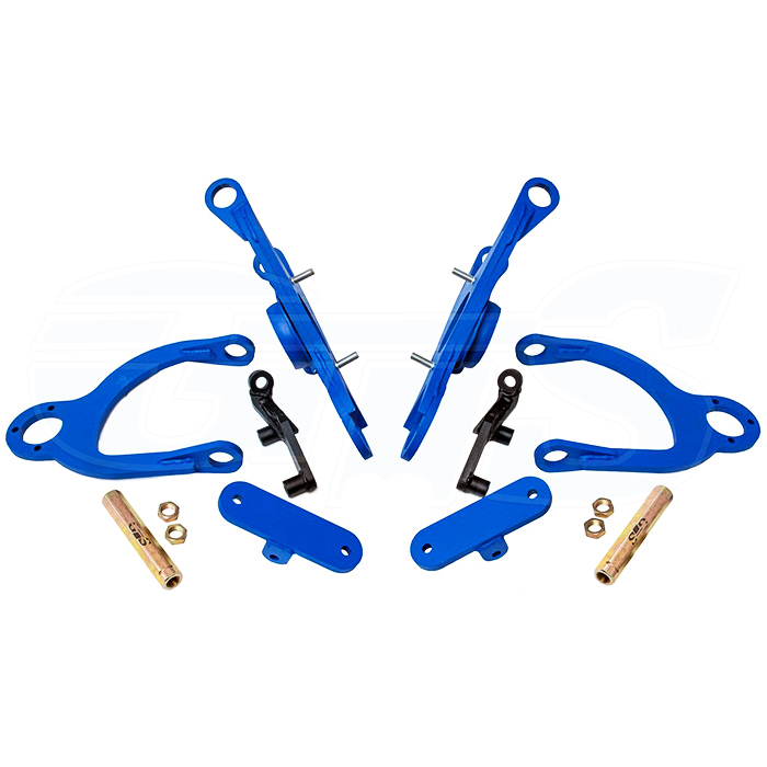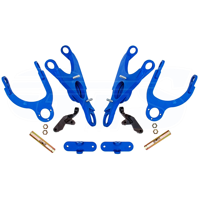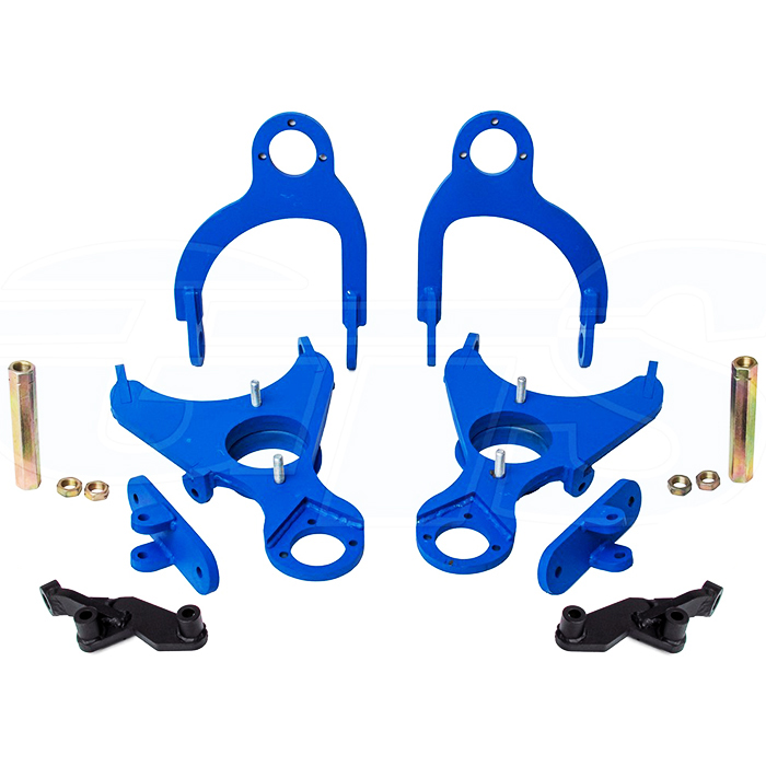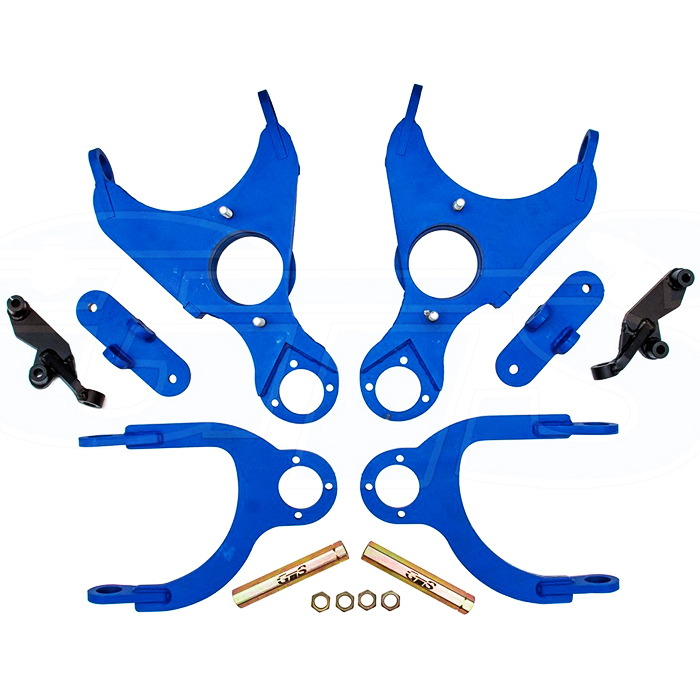 В комплекте: 2 верхних рычага, 2 нижних рычага, 2 усиленных кронштейна амортизатора, 2 укороченные рулевые сошки (-90 мм), 2 удлинённых шестигранных рулевых сгона (140 мм) с 4 контргайками.
