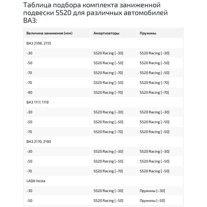 Заниженные (спортивные) стойки SS20 Racing - это новая серия продукции «SS20» для водителей, предпочитающих быстрый и активный стиль вождения, которым важен не только внешний вид автомобиля, но и правильная и стабильная работа подвески при занижении клиренса.