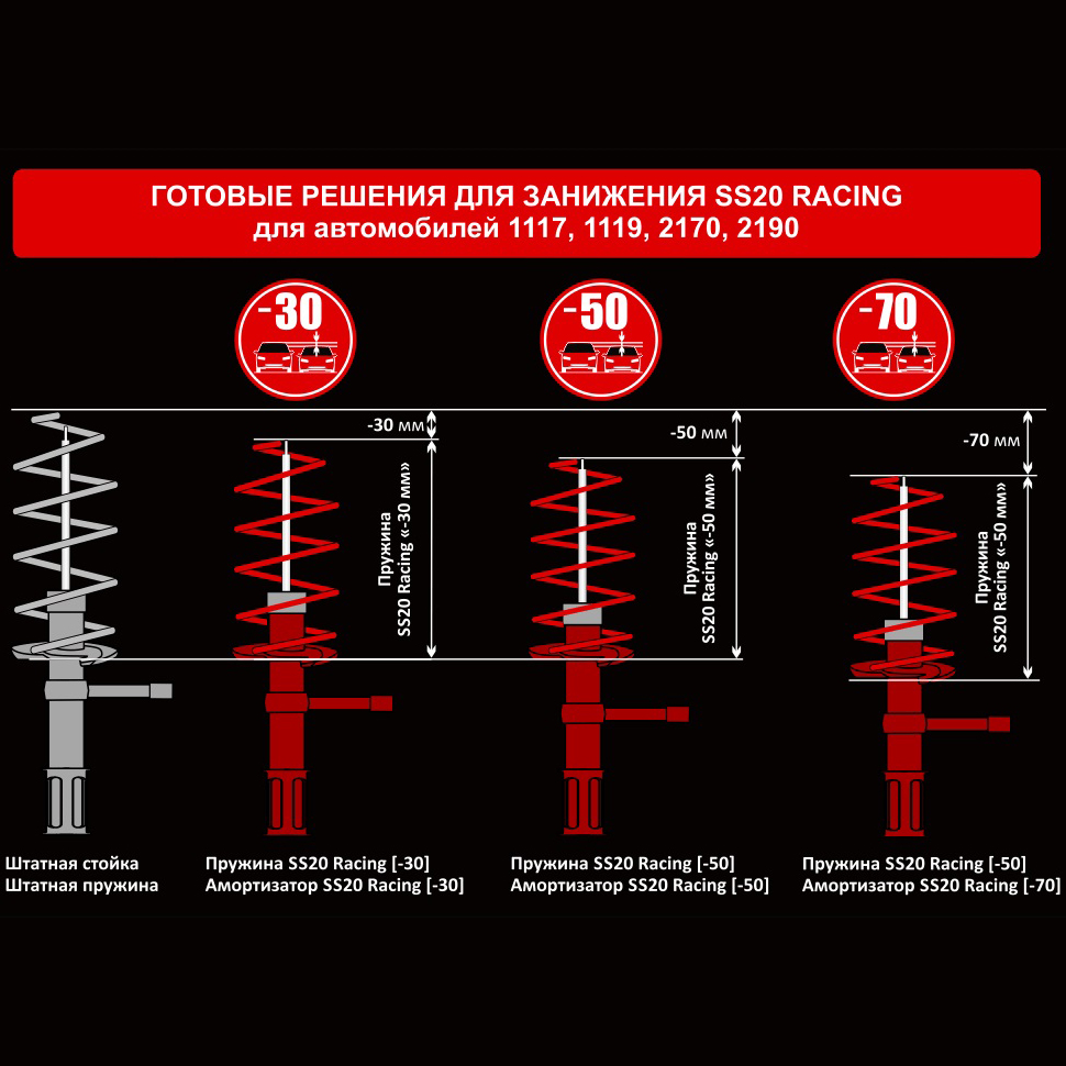 - занижение подвески автомобиля на 30, 50, 70 или 90 мм на ваш выбор;