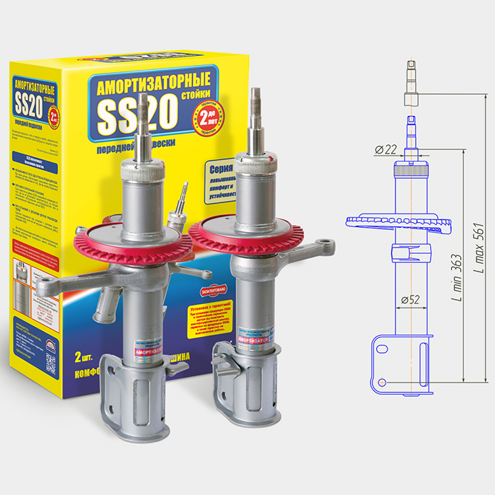 Стойки SS20, выпускаемые для семейства ВАЗ, имеют следующие модификации по степени жёсткости: «Стандарт», «Комфорт-ОПТИМА», «Шоссе» и «Спорт», что позволяет каждому водителю выбрать наилучшее сочетание комфорта и безопасности. Все стойки SS20 телескопические, двухтрубной конструкции. При производстве передних стоек и задних амортизаторов SS20 используются комплектующие и материалы только самого высокого качества, со 100% проверкой.