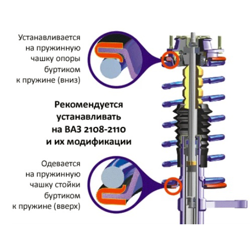 - шумоизолятор центрирует пружину относительно пружинной чашки, исключая её смещение и, как следствие, возможные контакты пружины с элементами кузова.