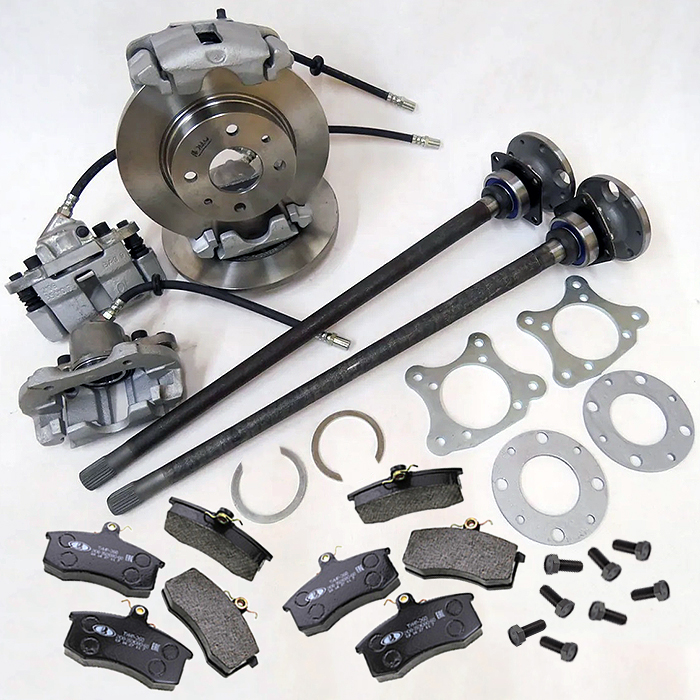 Задние дисковые тормоза устанавливаются вместо штатных барабанных без существенных доработок (при монтаже может потребоваться пропилить болгаркой скобы суппортов под болты крепления полуосей). Комплект содержит дистанционные шайбы толщиной 5 мм, которые устанавливаются между полуосью и тормозным диском и позволяют точно отцентровать тормозные диски в плоскости суппортов.