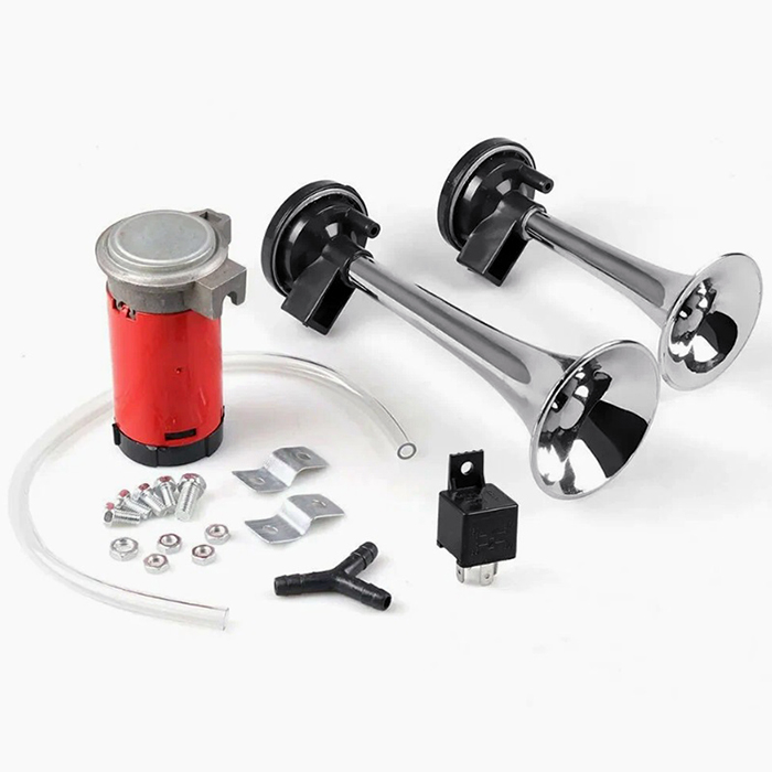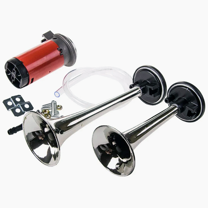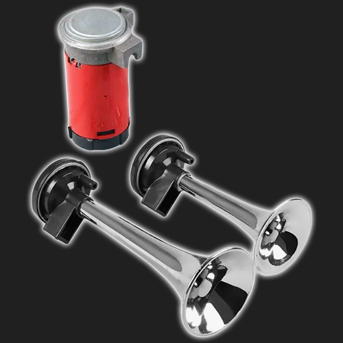 Двухрожковый (двухтональный) воздушный звуковой сигнал, раздельные рожки с компрессором, хромированные "дудки".