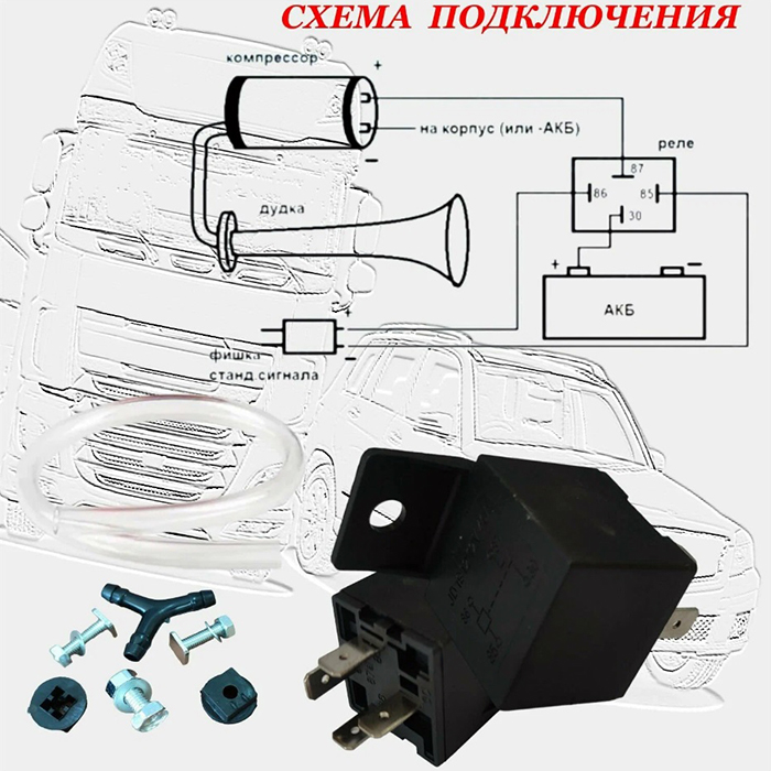 В комплекте: 2 рожка, воздушный компрессор, гибкая трубка, реле и набор крепежа.