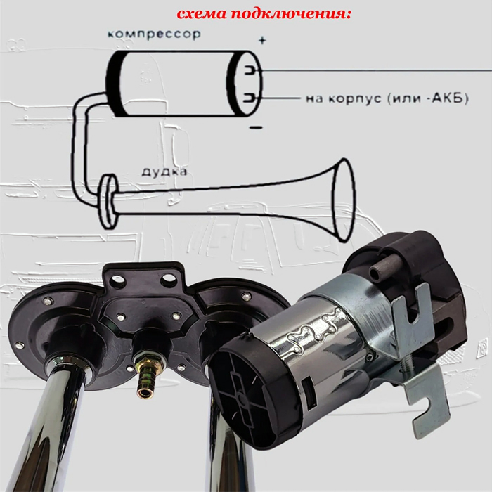 В комплекте: 2 спаренных рожка, воздушный компрессор, гибкая трубка и набор крепежа.