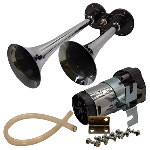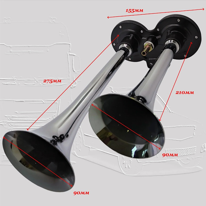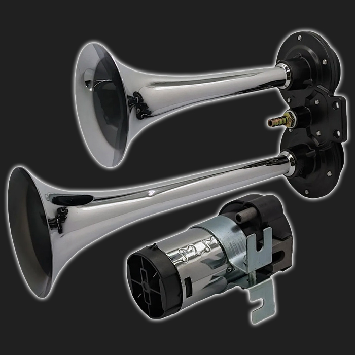Двухрожковый (двухтональный) воздушный звуковой сигнал, со спаренными рожками, в комплекте с компрессором, хромированные "дудки".